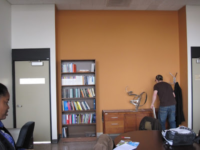 This was the first new design development sketch I developed in order to shake things up. It occurred to me that the room caused serious isolation among the fellows working in the Phenomenology Research Center. Why not bring them together? Of course privacy whilst working hard can be very important as well, so this bookcase divider formed a beginnings of a solution.