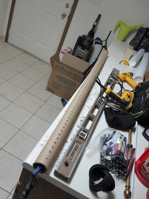 After the holes were drilled completely through the mailing tube (which took two stages) I began cutting the tube carefully on the Miter Saw. I used a stop to keep the cuts consistent, it is worthy to note that I did have to periodically adjust the stop due to the fact that my interpolation of the measurements were not one hundred percent accurate, the saw kerf was one of the factors that estranged the possibility of a perfect mark:Wednesday, February 24, 2010